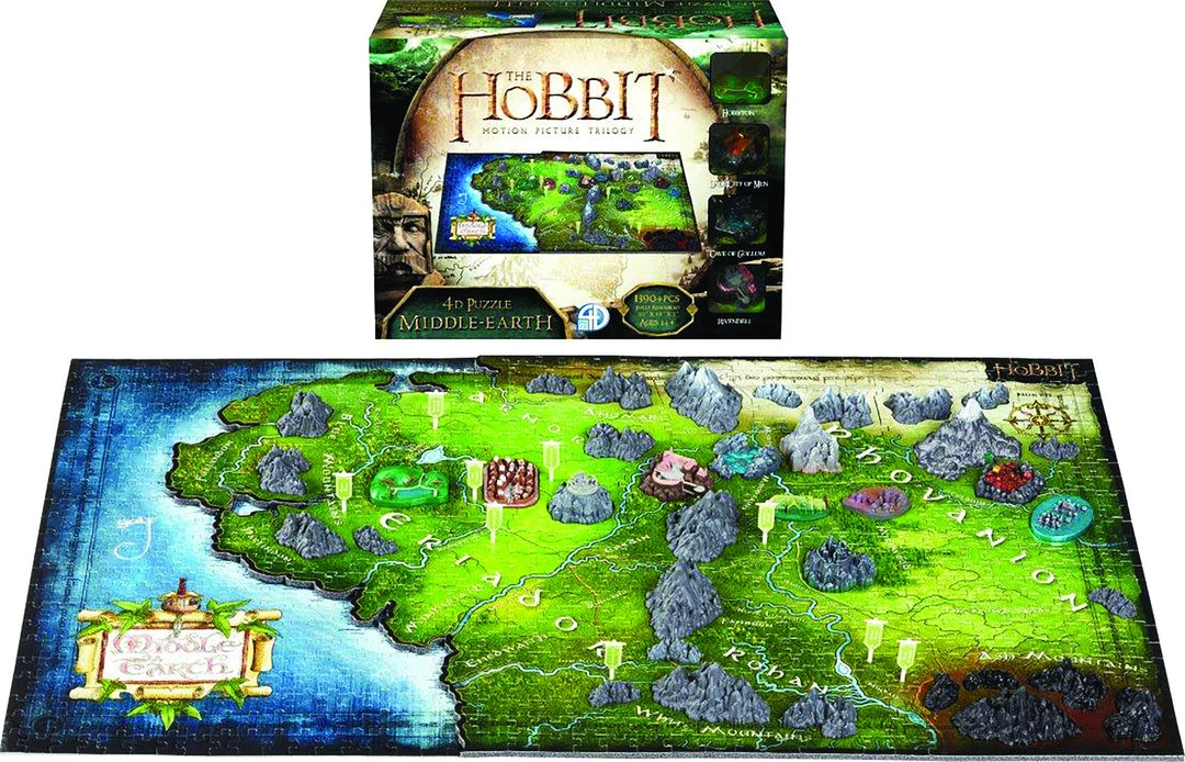 4D Cityscape is a patented, multi-layer puzzle that is fun, challenging, and educational. Inspired by J.R.R. Tolkien’s maps of Middle-earth from The Hobbit as adapted by Peter Jackson and his artists for the acclaimed film trilogy, this 3-dimensional map will take you from the Shire in the west, over the mountains to Rivendell, east through Mirkwood, and finally to the Lonely Mountain in the east. The first two layers of the puzzle to form a map of Middle-earth’s rivers, islands, cities, and geography.