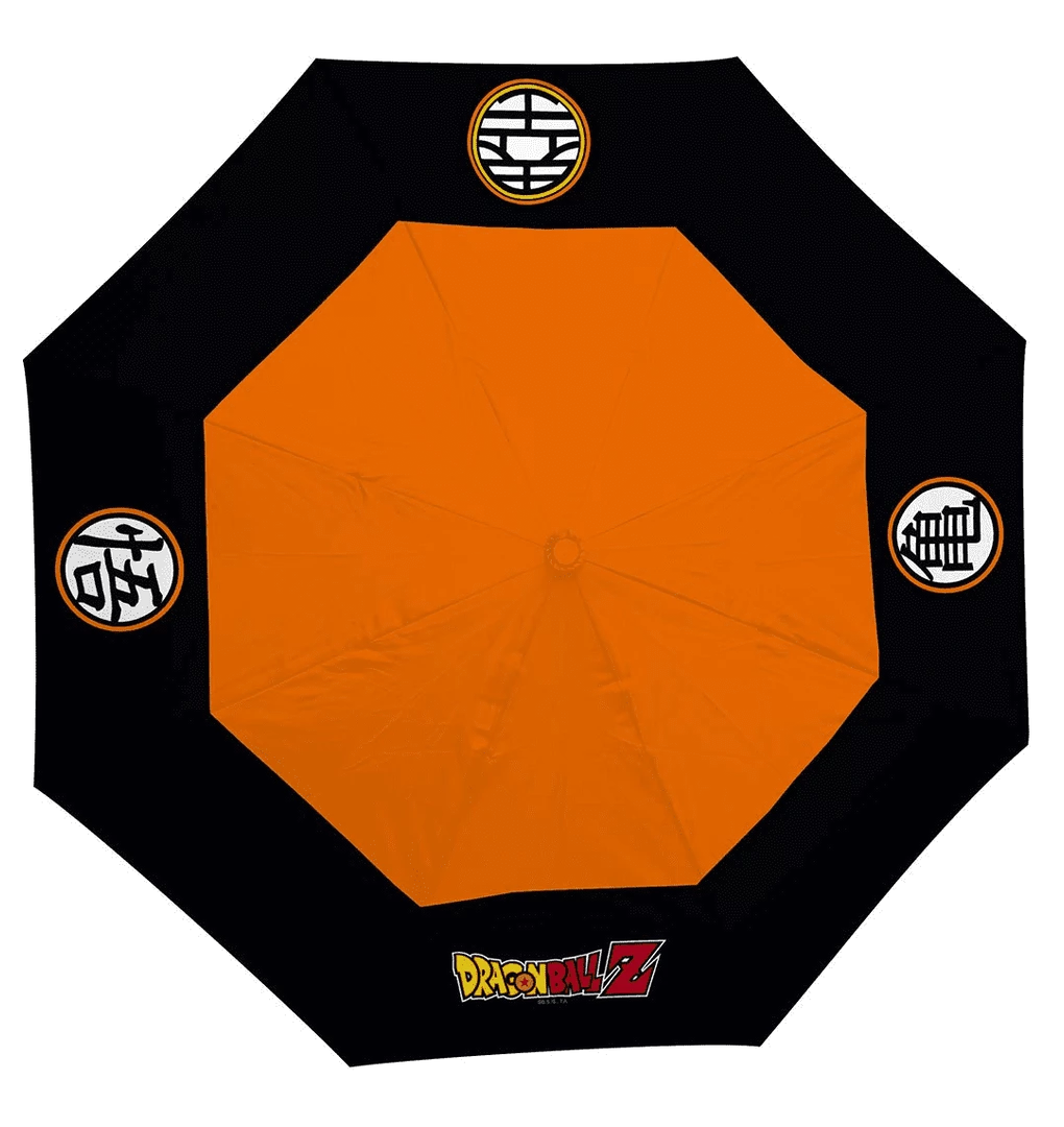 Show off your love of Dragon Ball Z with this stylish rain umbrella! Umbrella showcases Goku’s iconic symbols on a classic orange and black background. Semi-automatic umbrella with wrist strap and carrying pouch.
