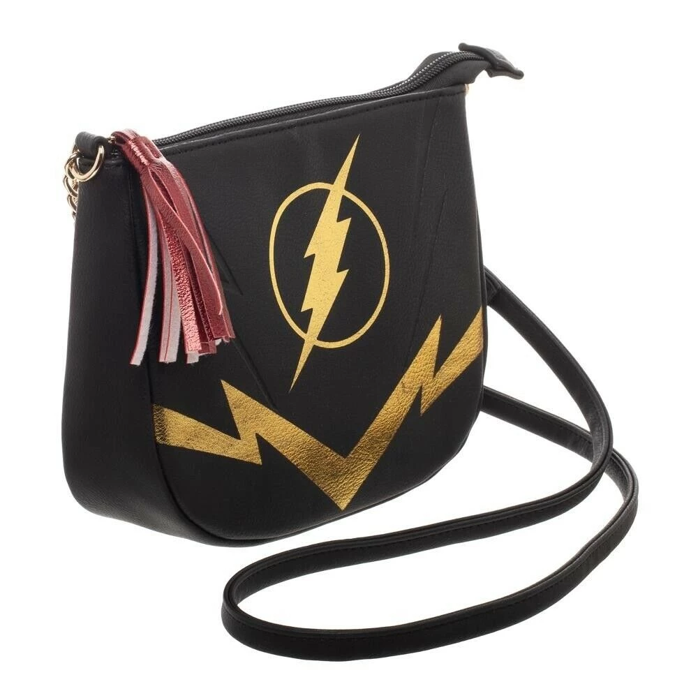 Officially licensed Flash crossbody tassel purse. This black polyurethane purse features the classic “Flash” logo and comes complete with a zip closure and metal charm detail. Measures approx. 7″ W X 5″ H X 2.25″ D.