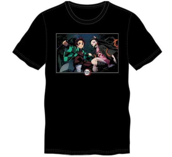 - This men’s short sleeve tee features a printed graphic of Tanjiro and Nezuko from the popular anime series Demon Slayer.