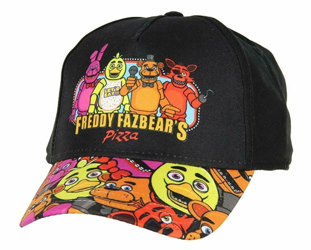 black hat features a Freddy’s character cast graphic on the front and and an