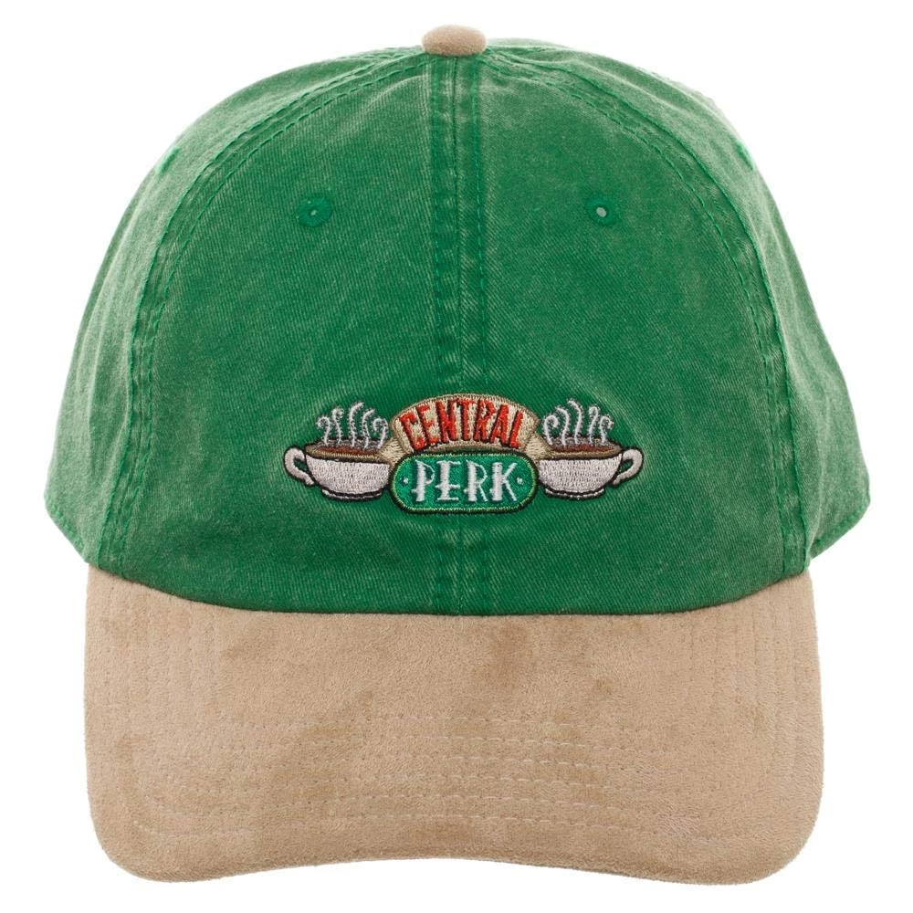 Friends suede brim strapback hat. This officially licensed hat comes in green with classic “Central Perk” logo on the front. Adjustable back.