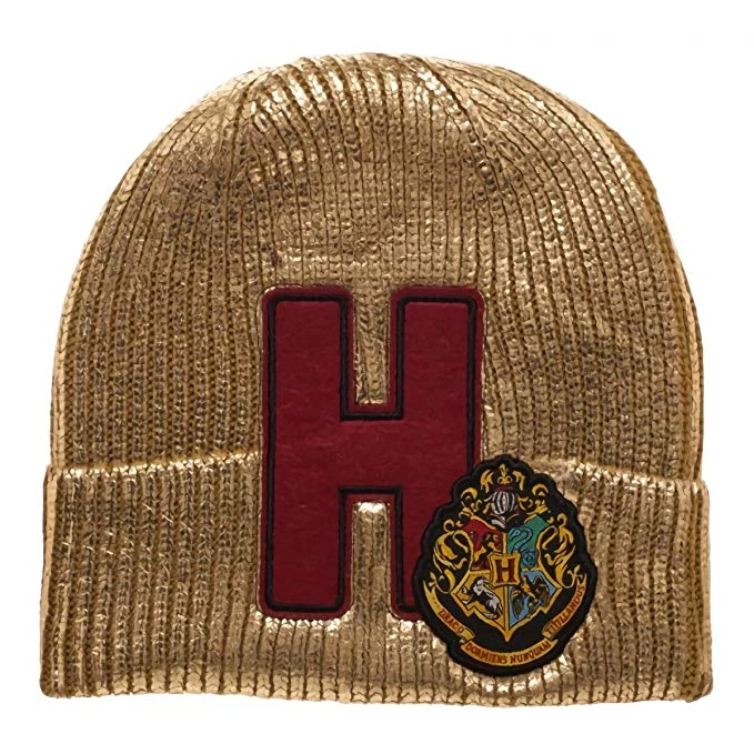 - You’ll be magically stylin’ in this golden knit beanie with a crimson “H” and Hogwarts crest appliques on the front.