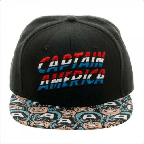 Marvel Comics Captain America Sublimated Flat Bill Snapback. Hat design features Retro Captain America Face Sublimated or Collage Print Bill.