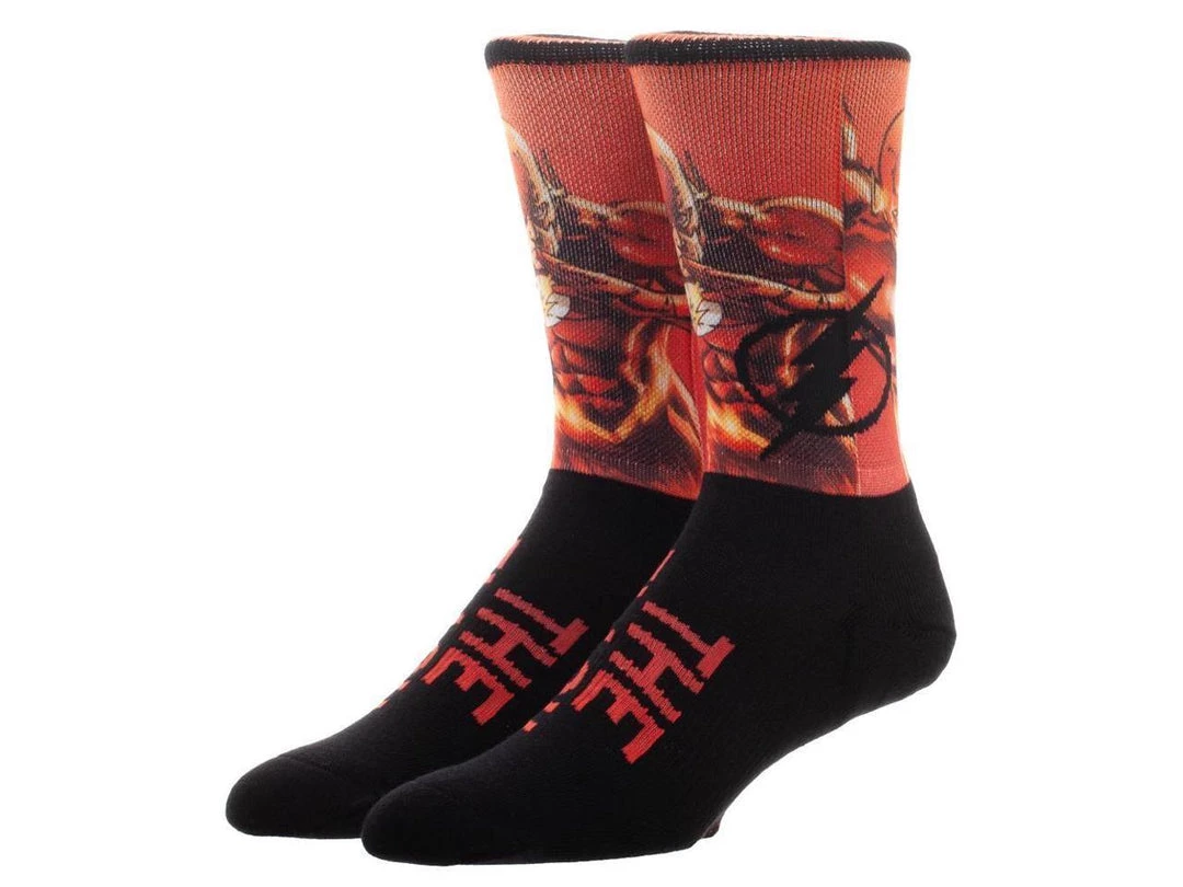 Officially licensed Flash sublimation socks for men, sock size 10-13. Knitted cotton foot, cushioned foot bed and arch support. 68% Polyester, 30% Cotton, 2% Spandex.
