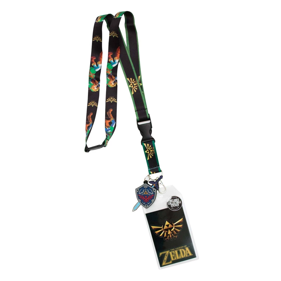 Black Legend of Zelda lanyard. Depicts comic images with a plastic card holder and Triforce keychain. Officially licensed. The Legend Of Zelda Link Lanyard
