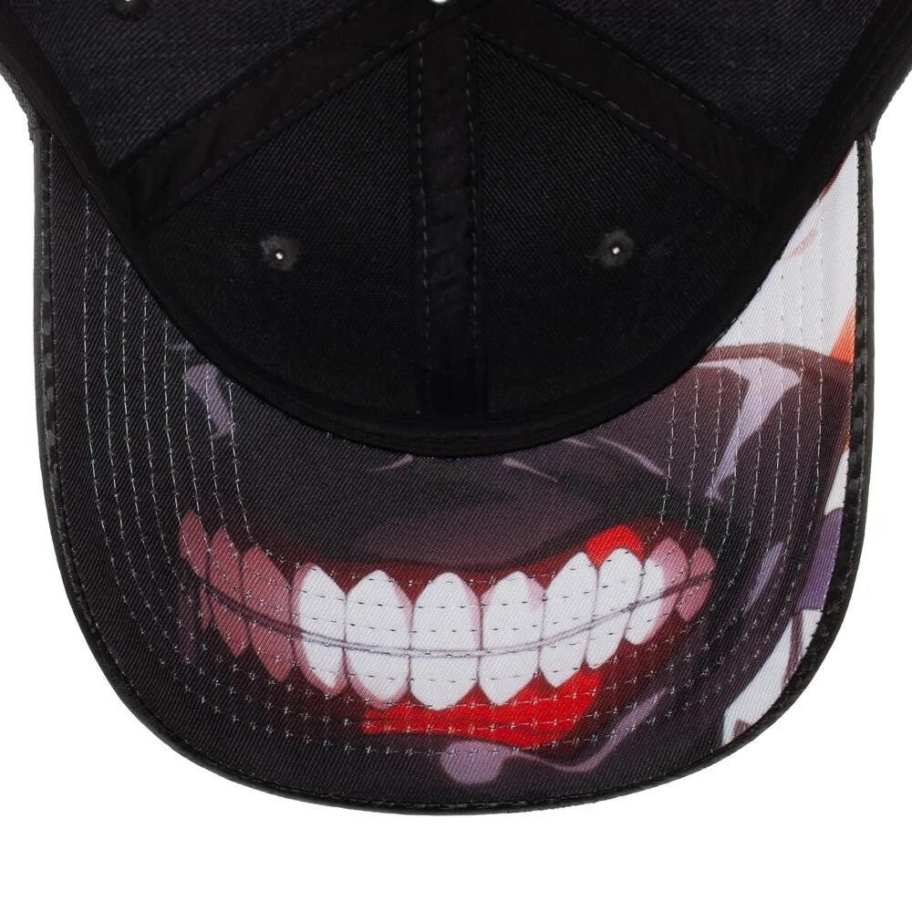 This hat features the Tokyo Ghoul logo in red front and center, a carbon fiber Pre-curved bill, and a sublimated image under the bill.   Adult, Size Adjustable. Made by Bioworld, Officially Licensed.