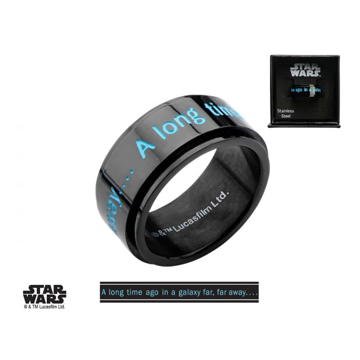 Stainless Steel Black Ion Plated Star Wars ” A long time ago in a galaxy far away?” Spinner Ring. Available Sizes: 6-15. Licensed Jewelry Packaging Included.