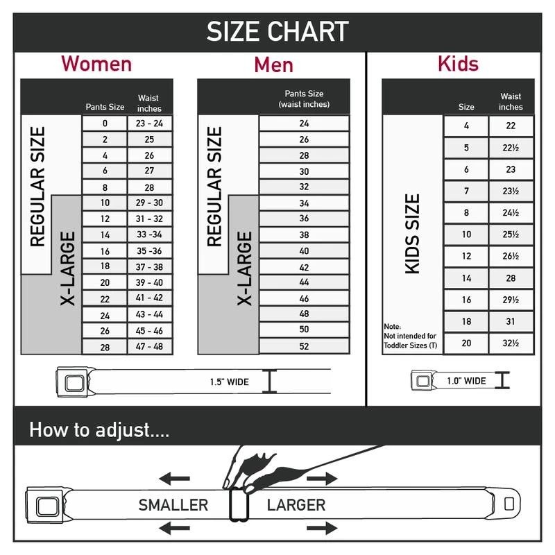 - Our Regular and XL Seatbelt belts are 1.5 inches wide and our Kid’s Seatbelt belts are 1.0 inch wide.