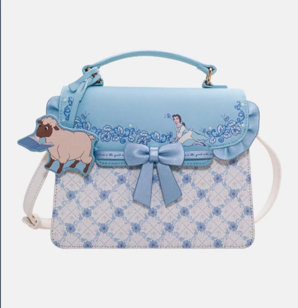 Adventure in the great, wide somewhere with this satchel inspired by Belle’s village outfit. A custom monogram, light blue print decorates the white base. The front flap features Belle, baroque accents, and a dandelion bouquet that will transport you to the hills of Belle’s quiet village. This satchel can be carried as a statement piece, and also includes a crossbody strap to go hands-free.