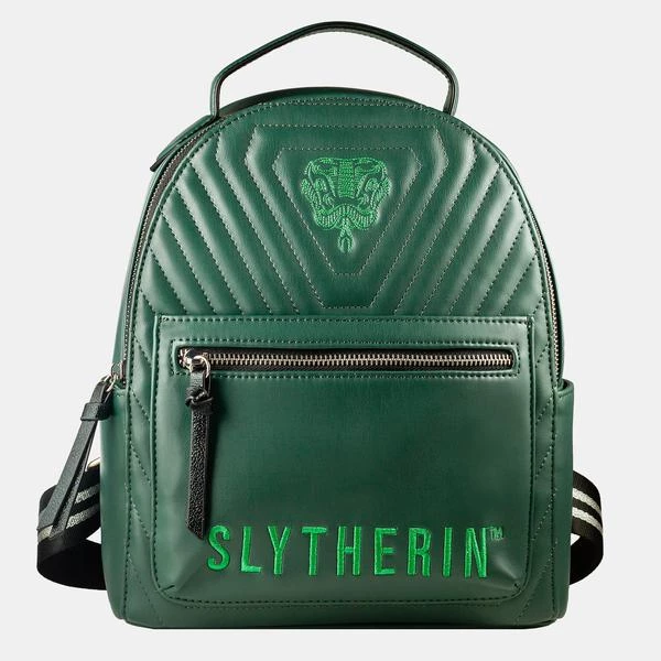 Cunning and ambitious, be daring and bold in this Slytherin quilted backpack. A deep green quilted bag, with light green embroidered accents. Featuring the text “Slytherin” and the house symbol of a snake. Achieve greatness with this functional backpack that includes adjustable straps, and 4 pockets.