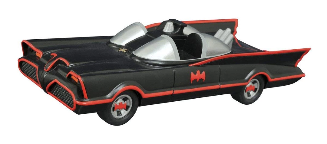 A Diamond Select Toys release! Everyone knows that Bat mobile has a lot under the hood, but now it’s got something else under there: your change! This vinyl version of the Bat mobile from the Batman Classic TV Series measures 9 Inch long and has a coin slot between the seats and an access door in the base, meaning this high-quality vinyl replica is also a bank, for storing your non-giant pennies and scarred silver dollars. Park it in your home Bat cave! Packaged in a clear polybag.