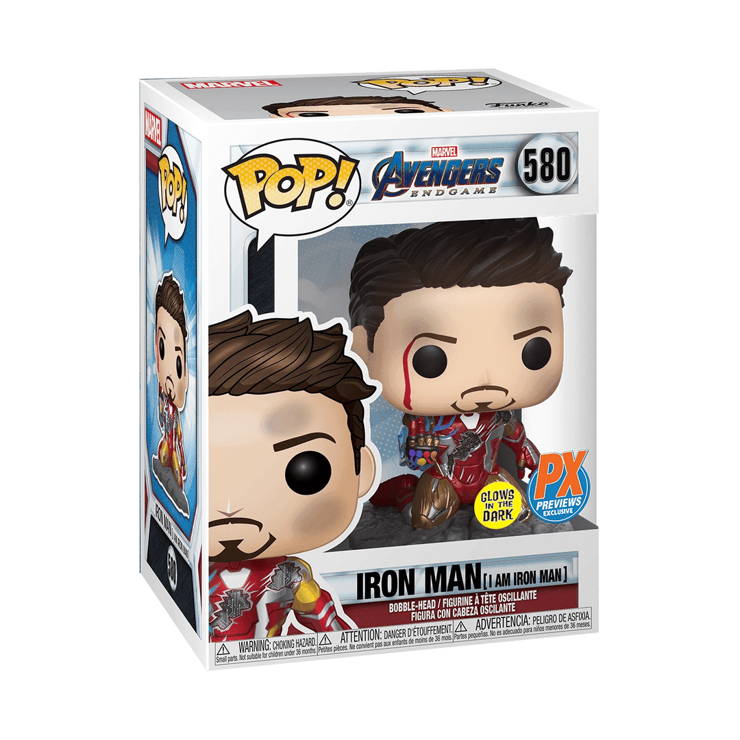 - This Previews Exclusive Iron Man Pop! features the dramatic battle-damaged Tony Stark as he kneels on a sculpted terrain base, complete with a glow-in-the-dark Arc Reactor and Infinity stones!