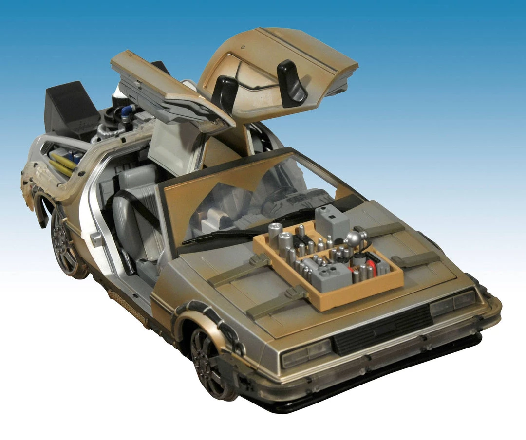 A Diamond Select Release. The time machine from the Back to the Future movies has undergone many changes. What started as a sports car combined with spare parts and some plutonium, became futuristic by the second movie. Upgrades like a “Mr. Fusion” power source and hover/flight capabilities certainly took the time machine to places where roads were not needed. An unplanned trip to 1885 stranded our traveler in the past, unable to run the time machine due to a lack of gasoline. After several failed attempts to get the time machine moving fast enough to reach 88 MPH, activate the flux capacitor, and make the return trip to 1985, the time machine was refitted for travel on the existing railways of the Old West.