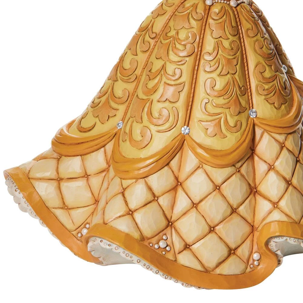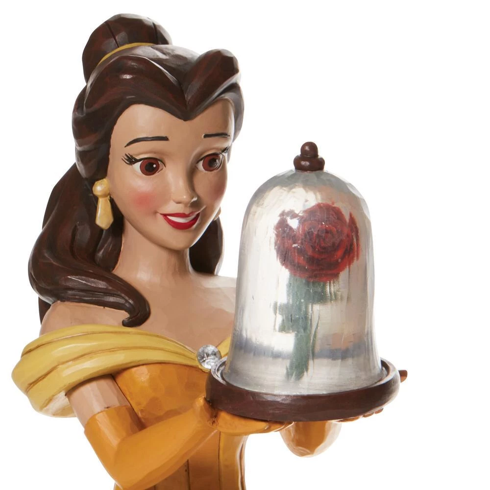 - The Disney Traditions collection by Jim Shore combines the magic of Disney with the time-honored motifs of handcrafted folk art. Holding the enchanted rose, Belle looks stunning in her characteristic golden ball gown. The tale of Beauty and the Beast teaches that anything is possible through love, so take some of it home with you in this 15″ Belle effigy designed by Jim Shore.Â