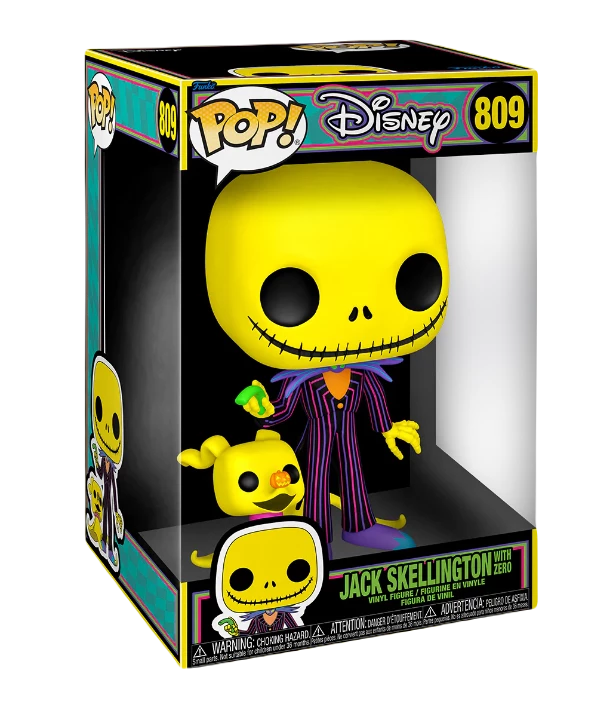 Treat yourself to a fetching addition to your The Nightmare Before Christmas collection! This Jumbo Pop! Jack Skellington with Zero appears in vibrant coloring that is designed to shine brightly under black light. These buddies from beyond are sure to inspire a playfully spooky atmosphere wherever they go. Vinyl figure is approximately 10-inches tall.