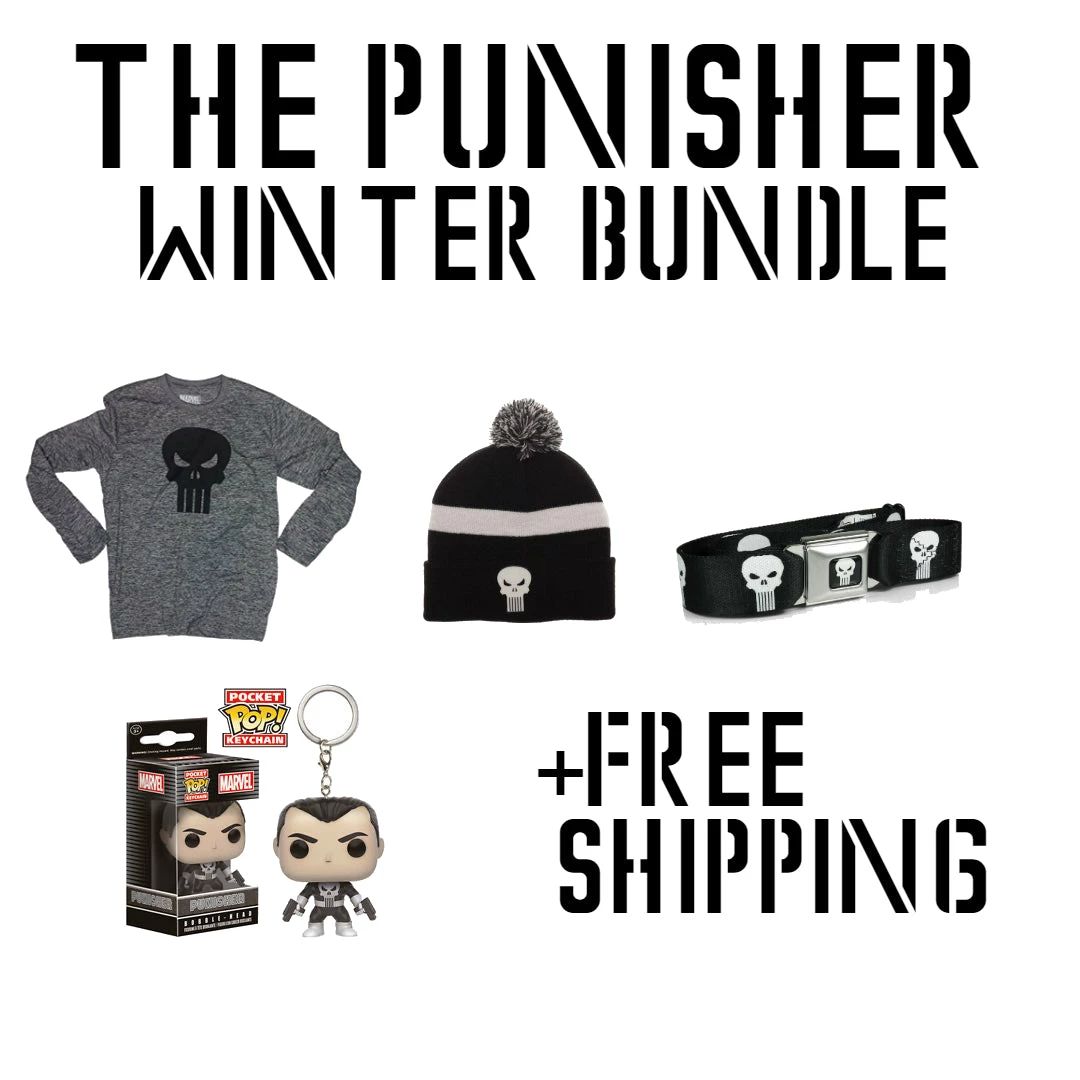 The Punisher Winter Bundle Comes with Punisher Belt, Funko Pop Keychain, Winter Hat and long sleeve Punisher Long Sleeve Shirt.