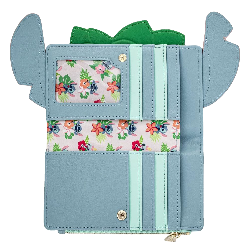The Lilo & Stitch Hula Cosplay Flap Wallet is made of vegan leather (polyurethane). Wallet snaps closed, has a zipper pocket with sturdy metal hardware, and features printed details. Take note of the coordinating design of the inside lining fabric.