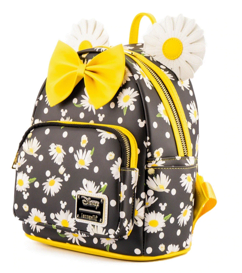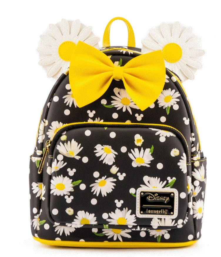 Get ready for spring with the Minnie Mouse Daisy Mini Backpack! The white daisies and polka dots stand out against the black background, adding a bright yellow zest to spring or even summer outfits. Between the daisy covered ears is a bright yellow bow, tying together the whole look. This bag will help you brighten the new year!