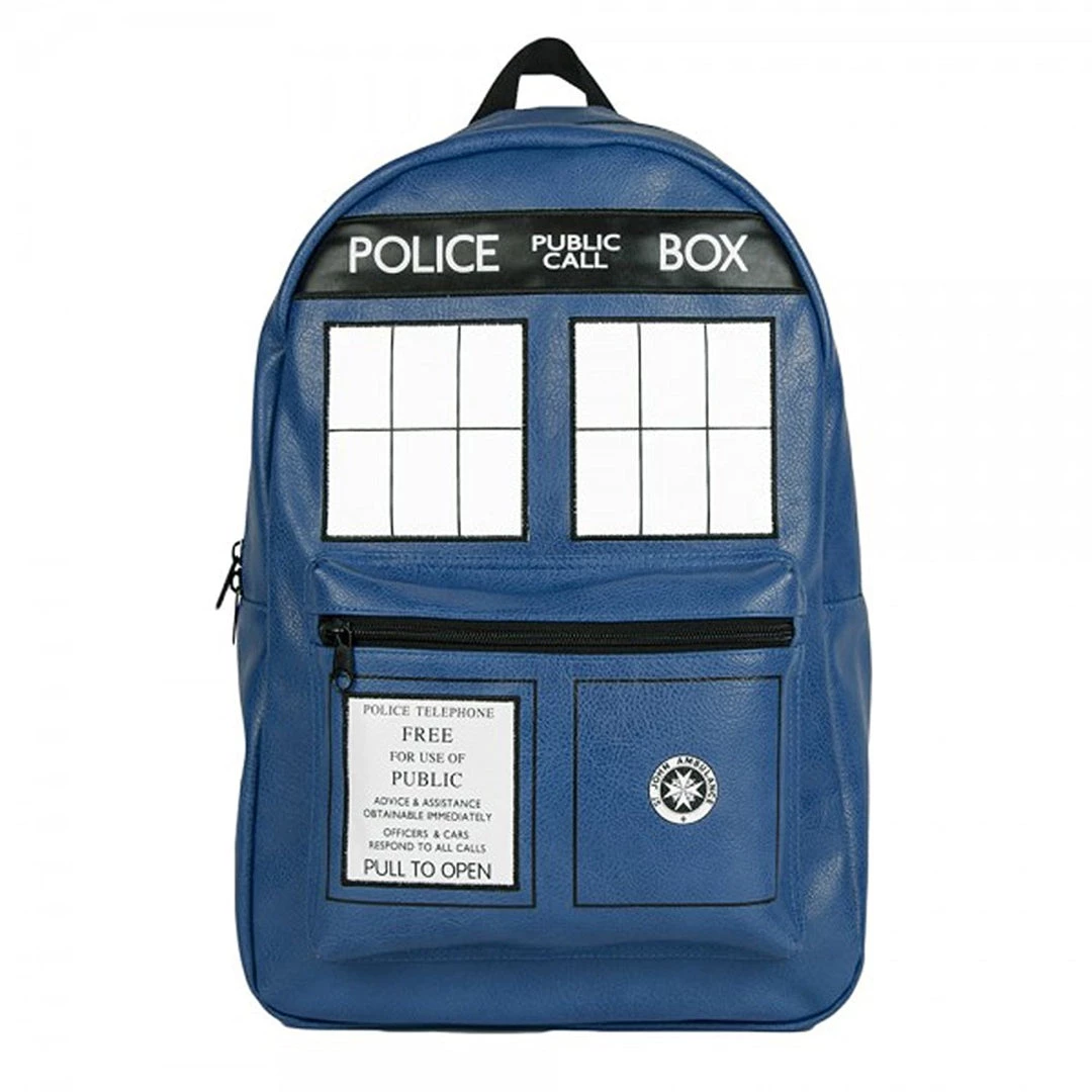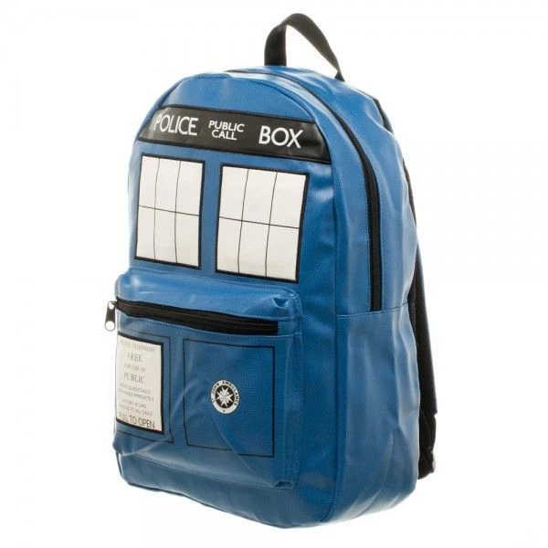 This officially licensed Doctor Who backpack features a TARDIS design on a blue vegan friendly faux leather backpack. Measures 12″W x 18″H x 5″D, with a front zip pocket and room main section.