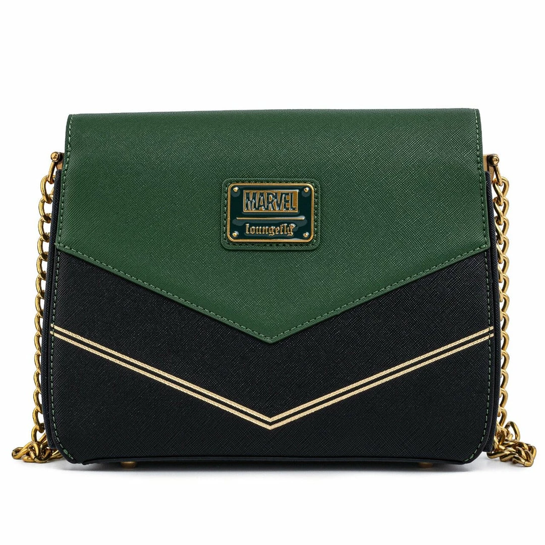 Crossbody Bag Loki. Beautiful faux leather bag from the Marvel collection by American designer brand Loungefly. The bag is inspired by Marvel superhero Loki. The bag has a flap with magnetic closure, a non-adjustable / non-detachable shoulder strap and a matching inner lining.
