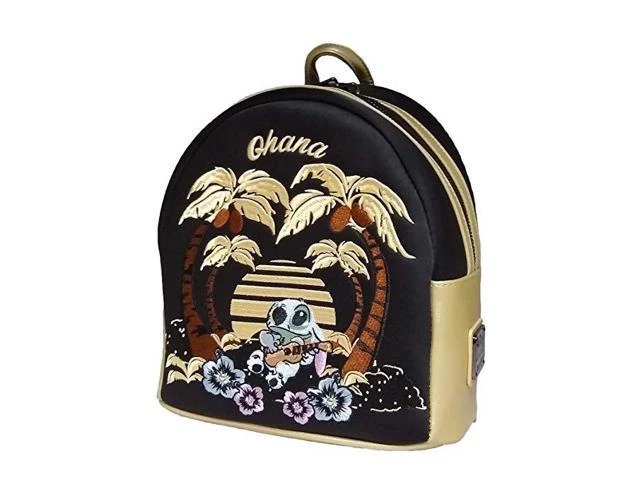 Aloha! Go on a Hawaiian rollercoaster ride with the Loungefly X Disney Stitch Ohana Mini Backpack. Made with super smooth satin, this whimsical Disney festival backpack features a dreamy embroidered front graphic of Stitch, the most beloved alien, playing guitar on the beach, amazing contrast faux leather detailing, adjustable straps, top zip closure and magnificent tropical print lining. Whether visiting another planet, or somewhere a little closer to home, this charming Stitch Loungefly backpack will become your favorite traveling companion.