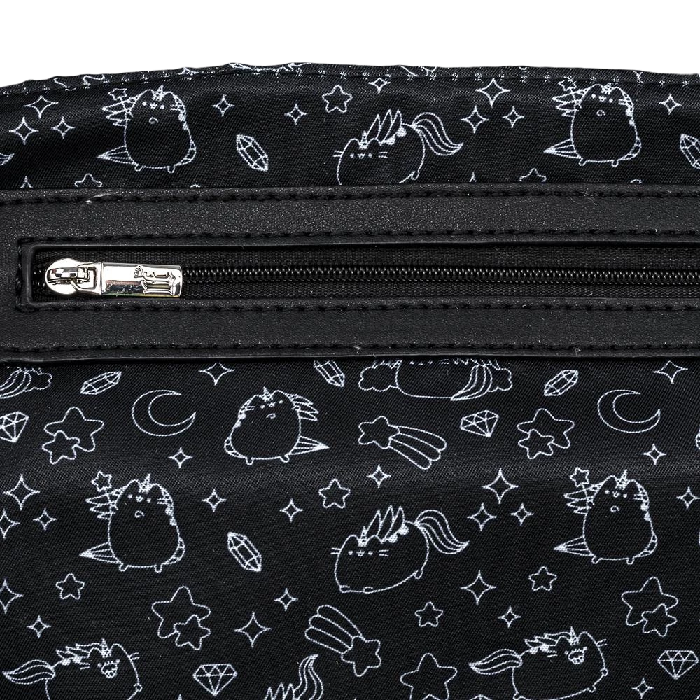 The Pusheen Rainbow Unicorn Crossbody is made of vegan leather (polyurethane). Bag has an adjustable detachable shoulder strap, sturdy metal hardware, and features: patent applique, and printed details. Take note of the coordinating design of the inside lining fabric.