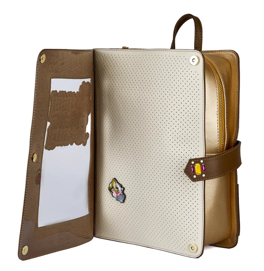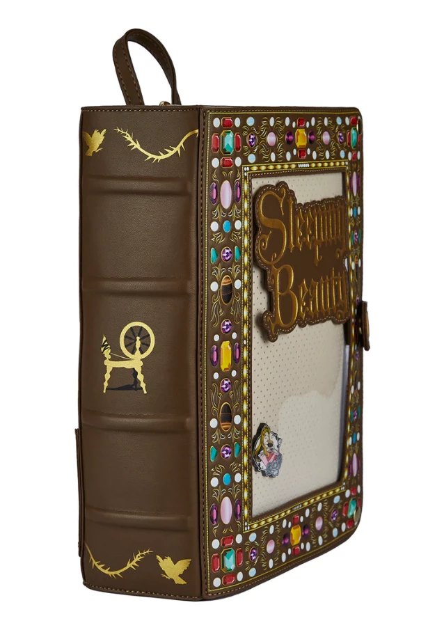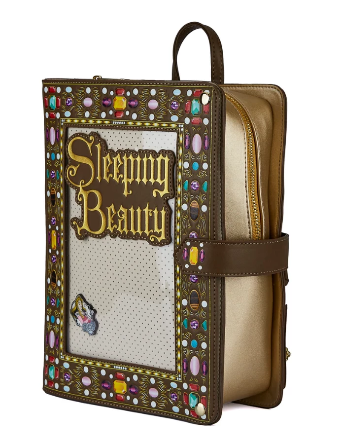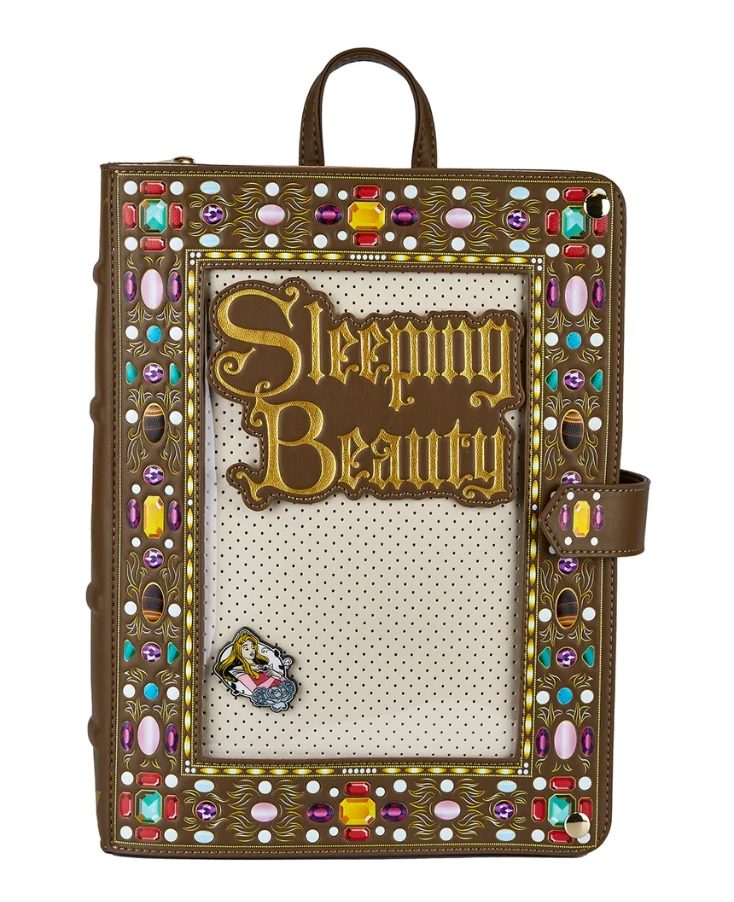 With the Loungefly Pin Trader collection you can wear and display all your favorite flair without having to pin through your clothes or potentially damage your other bags with pin holes! The Sleeping Beauty Pin Trader Backpack is designed to look like a beautiful storybook and can display your pins through the clear section of the front cover!