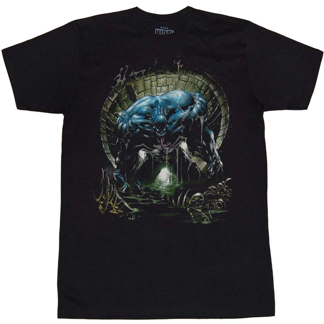 Enter the comic world of Marvel and crawl through the sewage tunnels, to find one of the universe’s most loved villains – Venom! Featuring Venom in all his distorted glory standing amidst one of several feeding pits a slimy tunnel, where Venom takes center stage. This black, standard fit t-shirt is composed of 100% cotton. Be sure to check out our Size Chart to get an idea of the average size and dimensions of this Venom Sewer T-Shirt style.