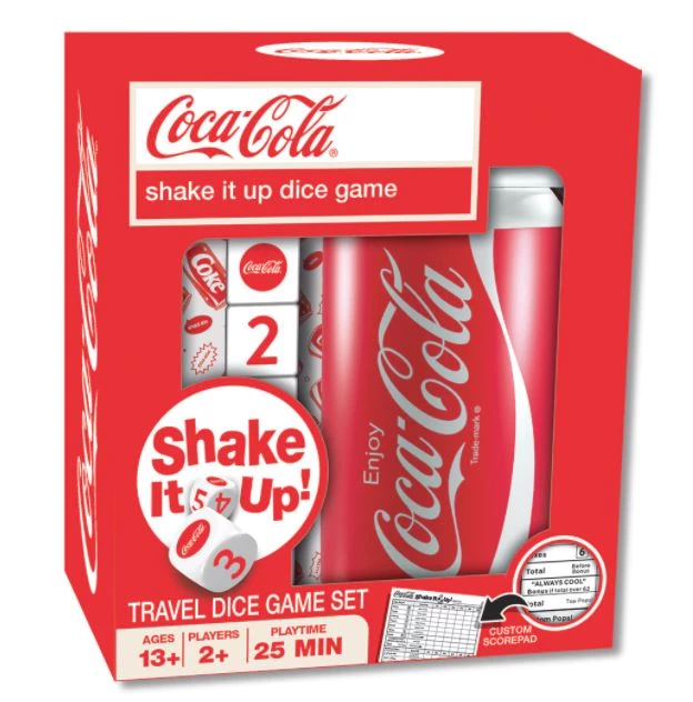 This MasterPieces Coca-Cola Shake it Up! Dice Game is a collectible travel dice game for Coke fans! This bubbly-rolling dice game is perfect for enjoying refreshing fun at home with the family. Try to get as many points as possible by rolling different combinations of all five dice. The Shake it Up! Dice Game includes a Coca-Cola can dice cup, 5 Coca-Cola dice, and a Coca-Cola scorepad! Two or more Coke fans, ages 6+, can play this travel dice game!