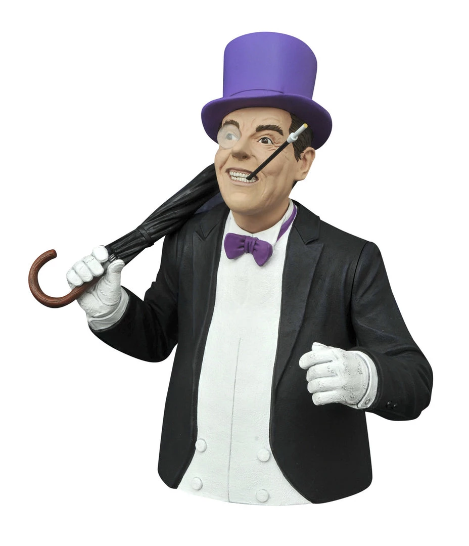 Start saving for a rainy day with this umbrella-toting Penguin bank! Based on the criminal character’s appearance on the Batman Classic TV Series, this approximately 8″ vinyl bank features the sculpting and paint of a high-quality bust, but the coin slot on his back and the access door in the base make it a great place to keep your loose change! Pair the Penguin with your Joker bank for the ultimate coin heist! Packaged in a clear polybag. Sculpted by Jean St. Jean.