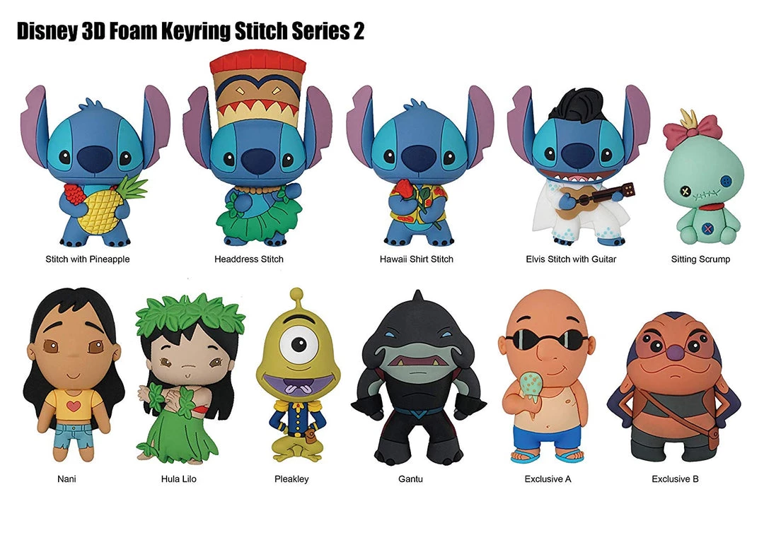 Lilo & Stitch Series 2 – 3D Foam Collectible Key Rings feature: Stitch with Pineapple, Headdress Stitch, Hawaiian Shirt Stitch, Elvis Stitch, Scrump, Nani, Hula Lilo, Pleakley, Gantu and exclusive chase figures: Icecream Man and Jumba.