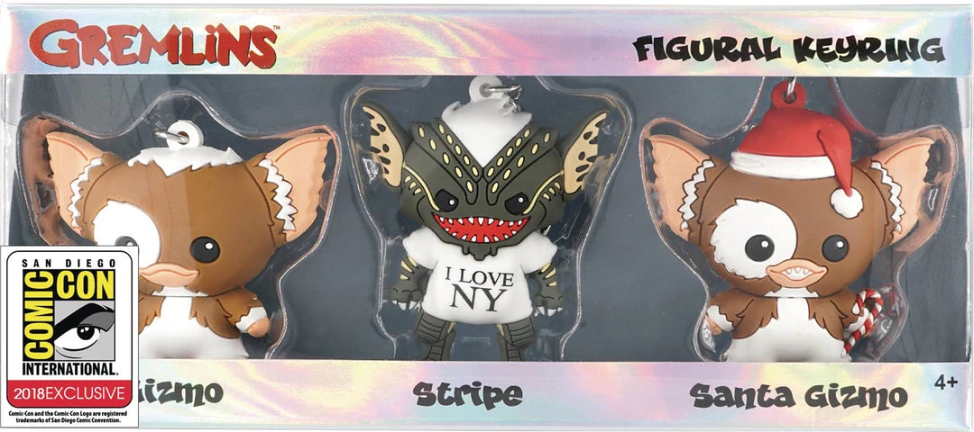 Bring the Mogwai and Gremlins from the cult favorite film Gremlins home with this 3-pack of foam figural keyrings! The set includes keyrings of Gizmo, Santa Gizmo, and Stripe. Previously an exclusive at San Diego Comic-Con 2018, this set is now available to a wider audience. Window box packaging.