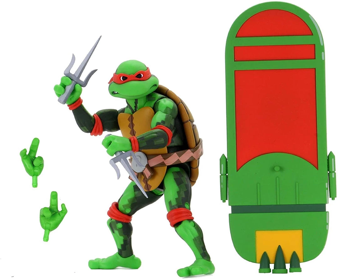 Oh Goodie. Fresh turtles for lunch! From the classic 1990s Turtles in Time video game, here comes this Series 2 Raphael 7-inch scale action figure. Raphael comes with his signature weapons and a hoverboard with display stand that can be used for even more poses. Raphael features special deco that recreates the pixilated look of the video game and come in individual window boxes with graphics from the original arcade cabinet.