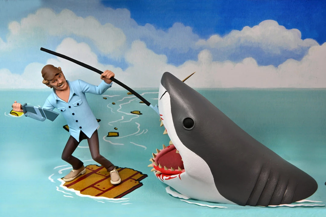 Joining the adorably creepy Toony Terrors lines are Quint and shark from Jaws! This 2-pack will include the pair in 6-inch scale, with machete and harpoon spear accessories for Quint and an extra fin for the shark. Comes in a window box packaging with a bonus cutout backdrop.