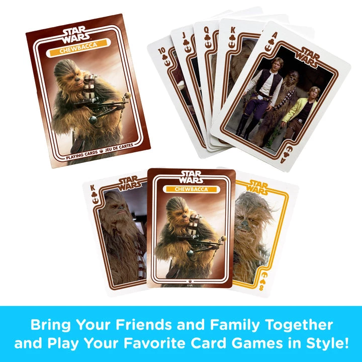UNIQUE DESIGN ON EVERY CARD:Â This Star Wars deck of playing cards includes 54 cards (52 playing cards and 2 jokers). Every single playing card features its own distinct Chewbacca-themed design and art. No two cards are alike