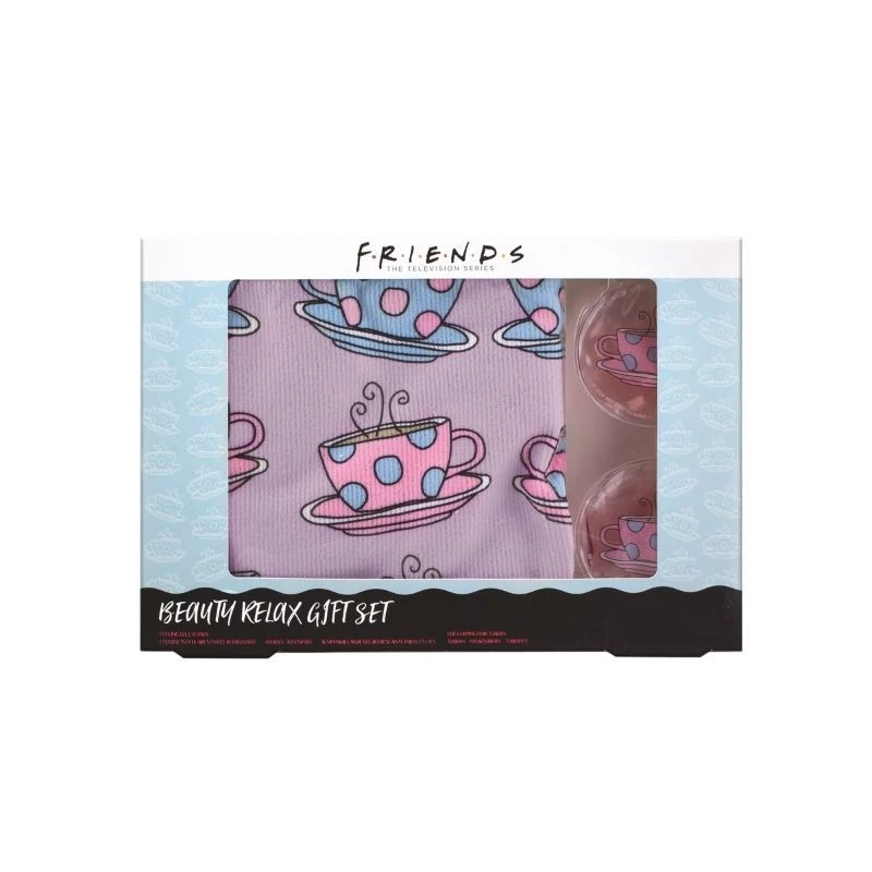 This officially licensed Friends Beauty Relax Gift Set contains two cooling gel eye pads and a quick-dry hair turban. All items feature a pastel pink and blue coffee cup design.