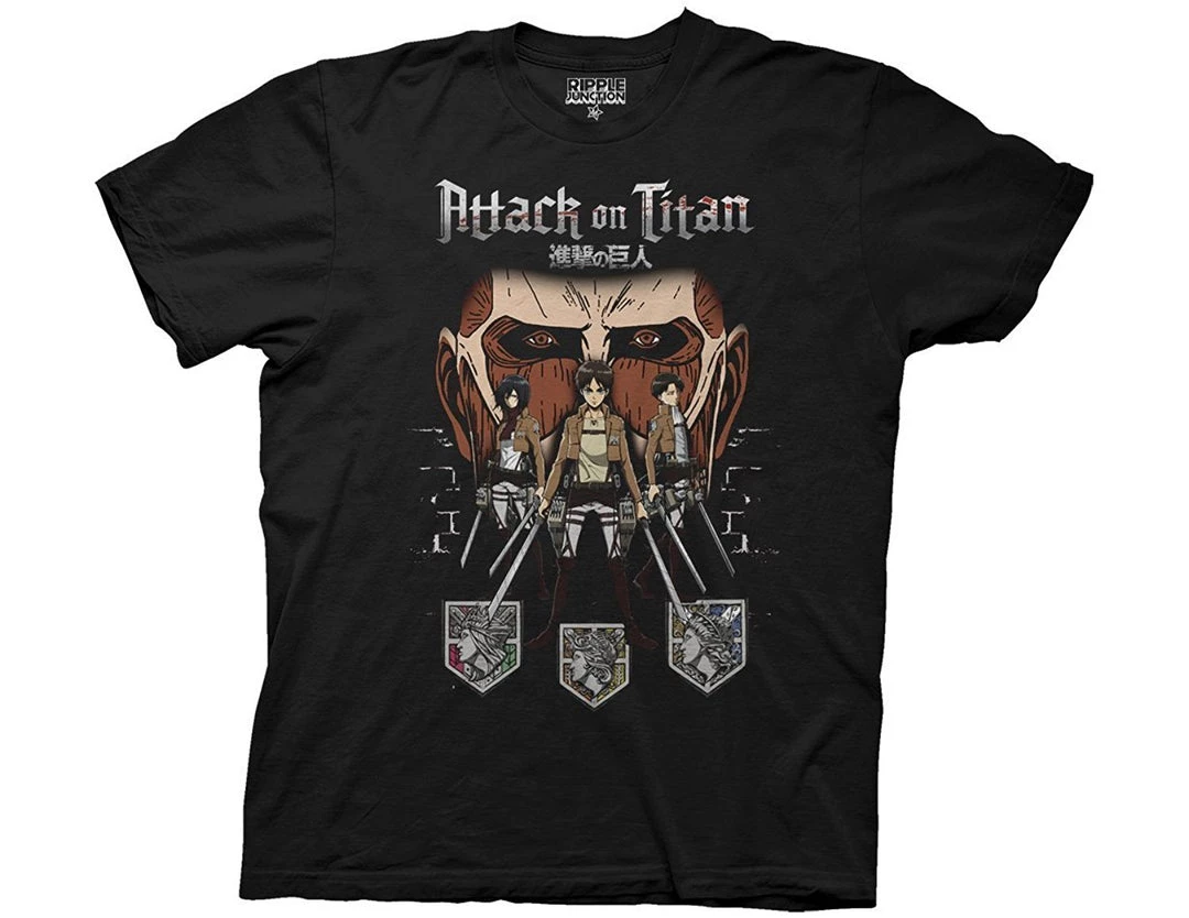 Black slim-fit T-shirt with Attack on Titan design on front.