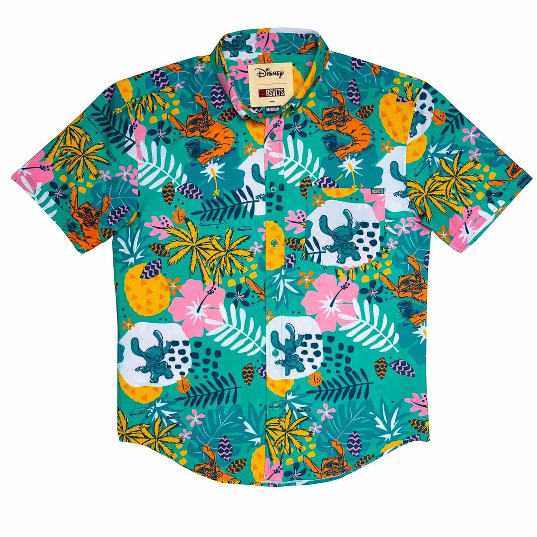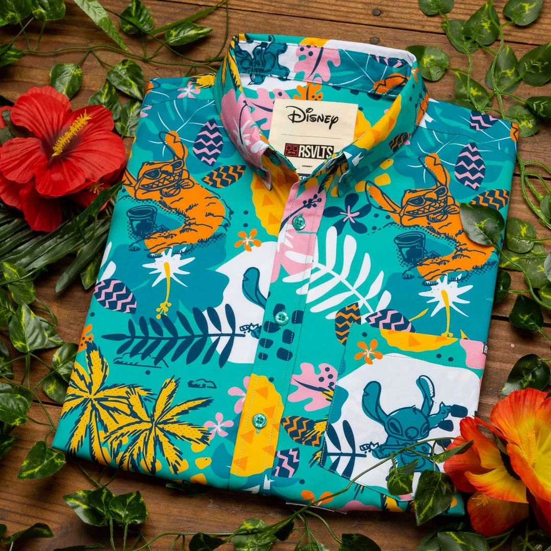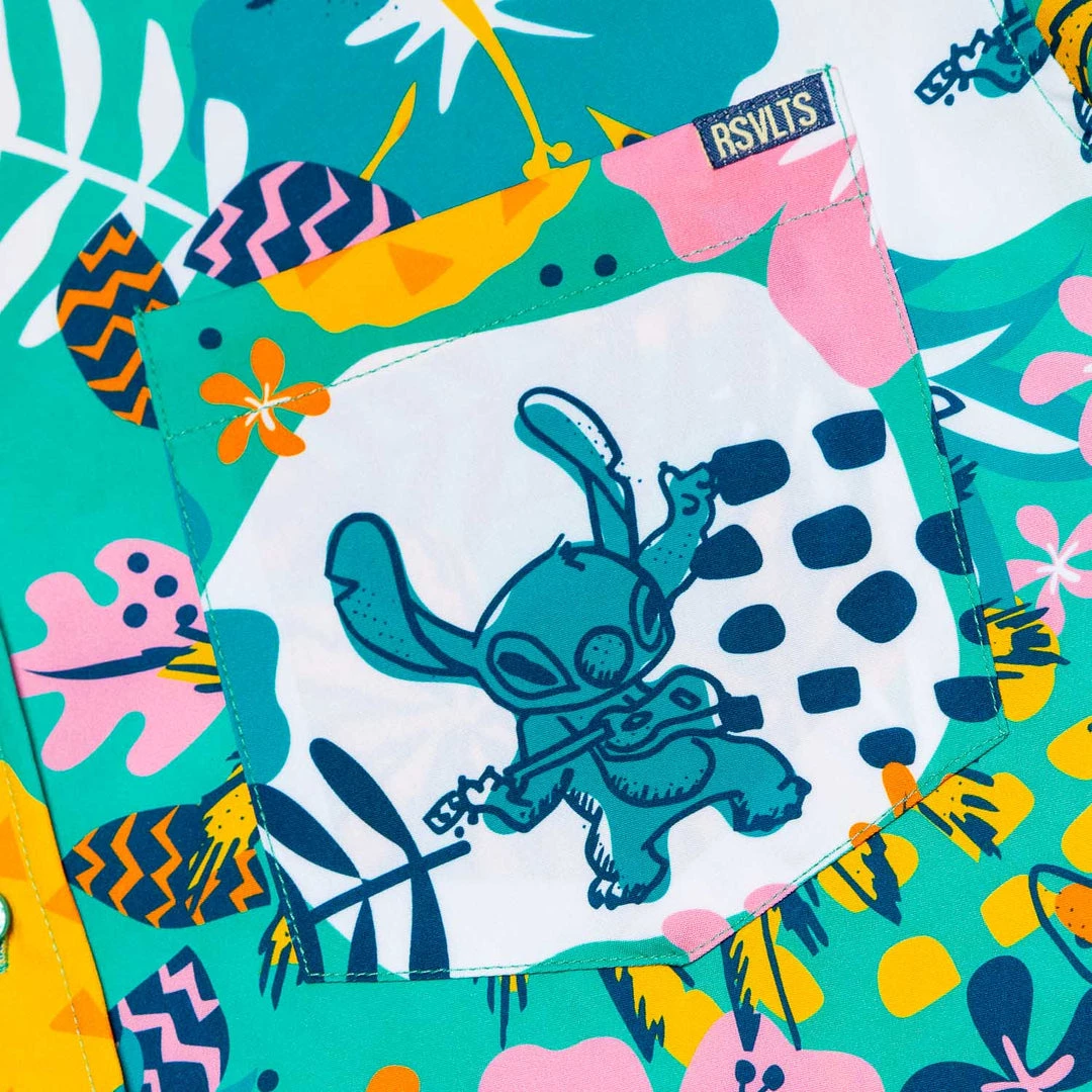 This bright and colorful KUNUFLEX™ button down is an ode to Stitch living his best life, happy as a local, carefree as a tourist, cool as the day is long.