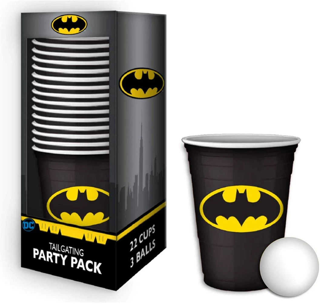 - Batman tailgate party pack includes 22 disposable plastic cups and 3 ping pong balls