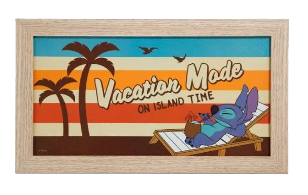 Get some island vibes in your décor with this wood wall art from Lilo & Stitch. Stitch is laying on a sun bed with a coconut drink with “Vacation mode on island time” above and palm trees, birds and stripes in the background.