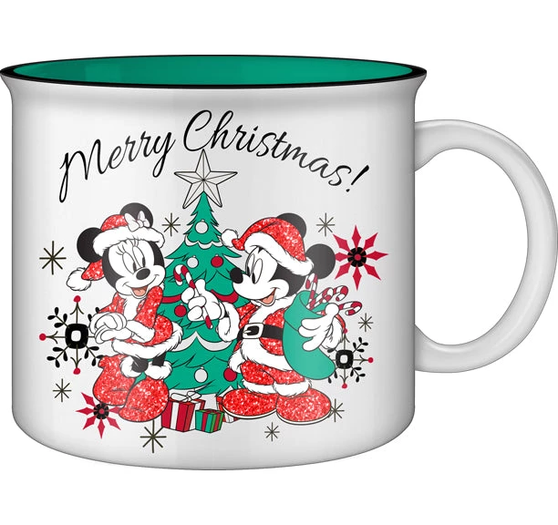 MERRY CHRISTMAS MICKEY AND MINNIE GLITTER 20oz CERAMIC CAMPER MUG