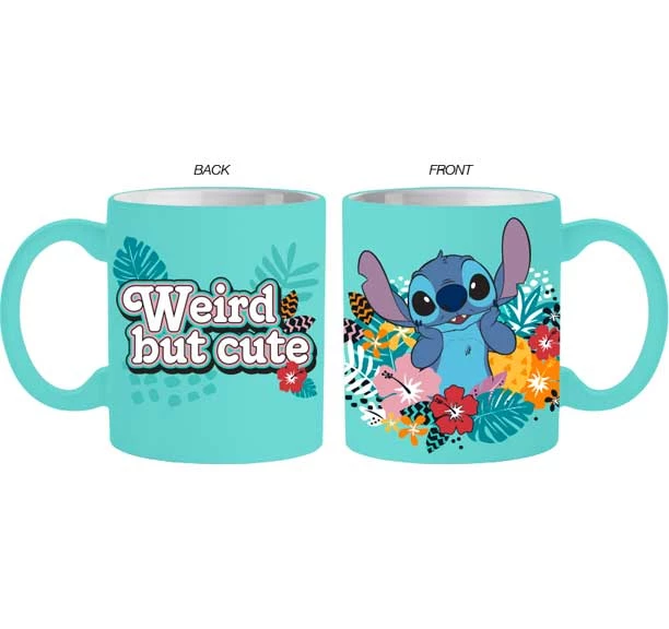 - The mug’s design features Stitch in a bed full of flowers; the back has the phrase “weird but cute” on a blue mug with a white interior
