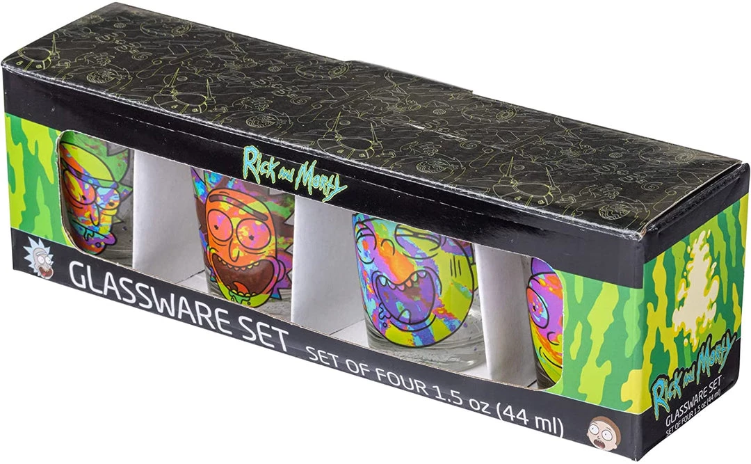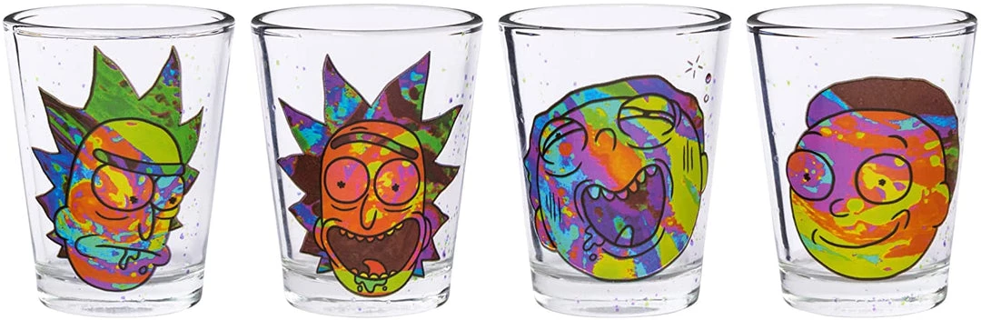 - MINI GLASS: Officially licensed Rick and Morty mini glasses that feature colorful character faces from the TV show. Each glass holds 1. 5 ounces of liquid and features a different colorful character face on the front