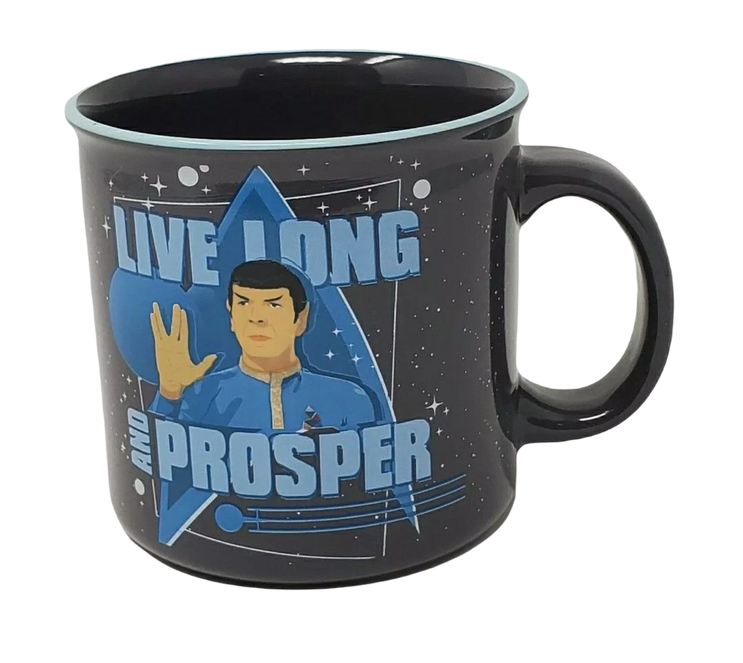 - This 20 oz Coffee Mug features Spock from Star Trek doing the Vulcan Salute. Around him are his famous words “Live Long and Prosper”.