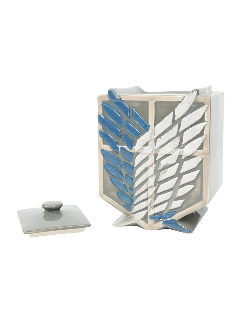 From the Japanese manga series Attack on Titan comes this lidded cookie jar in the shape of the classic Scout shield logo.