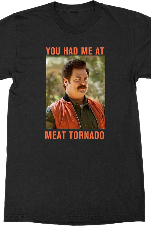 This Parks and Recreation t-shirt features an image of the director of the Pawnee parks and rec department, Ron Swanson. The shirt reads You Had Me At Meat Tornado.