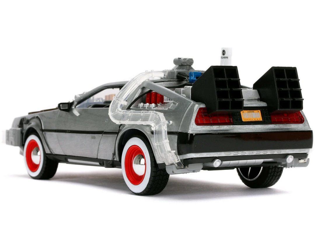 - Brand new 1/24 scale diecast car model of DeLorean Brushed Metal Time Machine with Lights “Back to the Future Part III” (1990) Movie “Hollywood Rides” Series die cast model car by Jada.