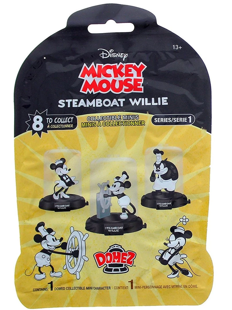 The Disney Mickey Mouse Steamboat Willie Domez Collectible Minis series includes Mickey with Ship’s Wheel, Peg Leg Pete, Minnie with Fiddle, Parrot, Goat, Mickey with Soap, Mickey Mouse and Minnie Mouse. Which one will you get? It’s a surprise!
