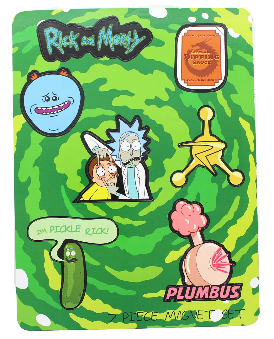 - FUN DESIGN: Set includes 7 flat magnets, including Rick and Morty, Pickle Rick, a Plumbus, Mr. Meeseeks, Council of Ricks logo, and a container of Szechuan dipping sauce!